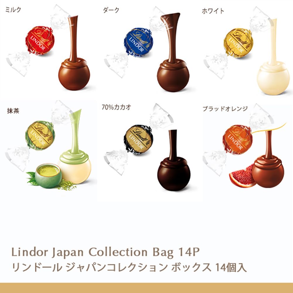 - 【内容量】14個 【内容】リンドール(ミルク 3個、ダーク 2個、ホワイト 2個、70%カカオ 2個、抹茶 3個、ブラッドオレンジ 2個)【パッケージサイズ】約14.8×14.8x3cm