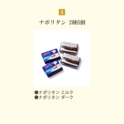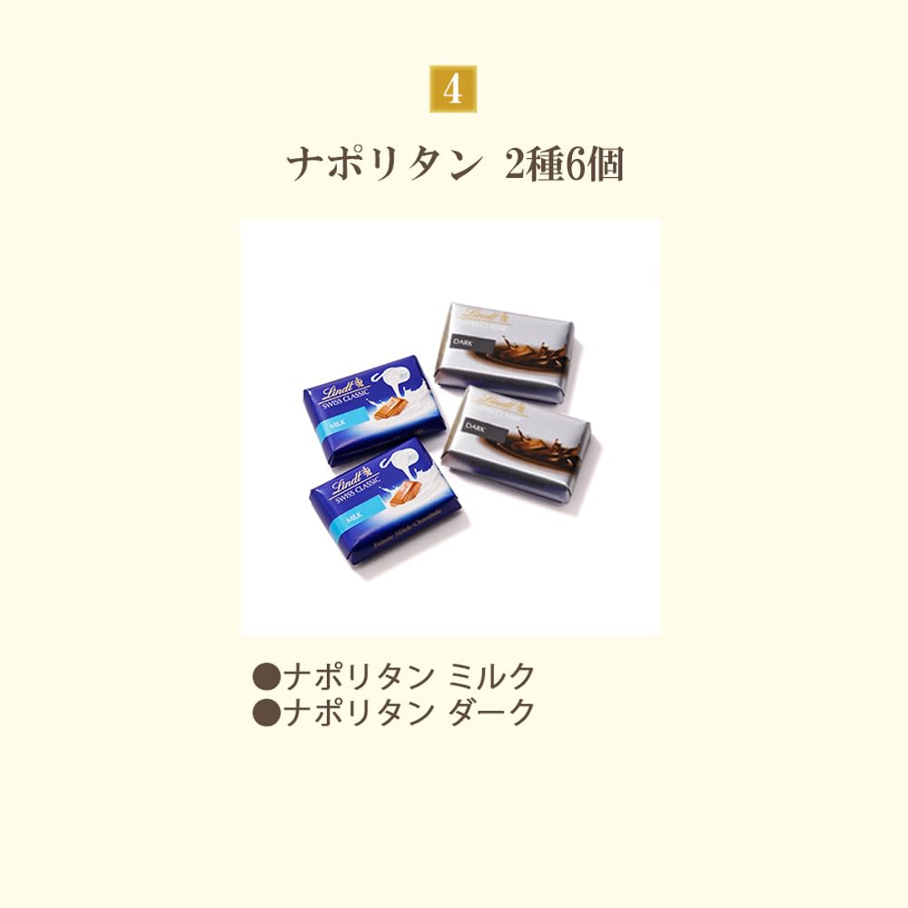 - 【内容】リンドール(ミルク1個、ホワイト1個、ダーク1個、ヘーゼルナッツ1個、キャラメル1個、ストロベリー&クリーム1個)、ナポリタン(ミルク3枚、ダーク3枚)、バストンチーノ(ミルク2個、ミルクシリアル2個)、ヌクソー(ミルク1個、ダーク1個)