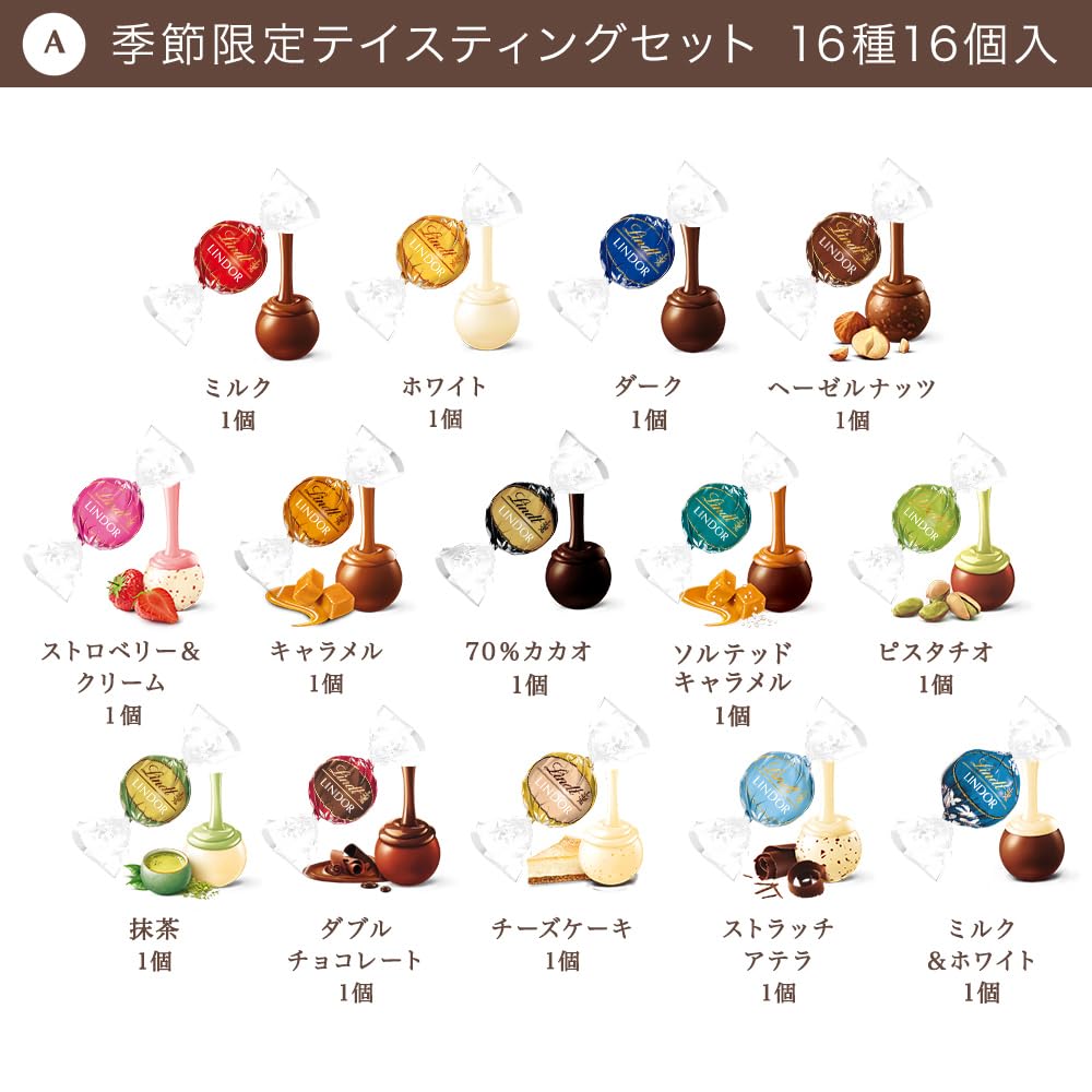 - ギフトにも、ご自身へのご褒美用にもおススメなアソートボックス春限定の「さくら&クリーム」を含む、16種類のリンドールをアソートしたテイスティングセットです。贈り物にはもちろん、ご自身へのご褒美にもおすすめ!16種類のフレーバーからお好みのフレーバーがきっと見つかります。リンドールは、色とりどりのラッパーに包まれた、リンツで一番人気の丸いチョコレート。外側と内側の二層構造で、外側のチョコレートシェルを破ると、なめらかなフィリングチョコレートがお口の中でとろけ出して、リンツ自慢のチョコレートのくちどけと香りを口いっぱいに感じて頂けます。